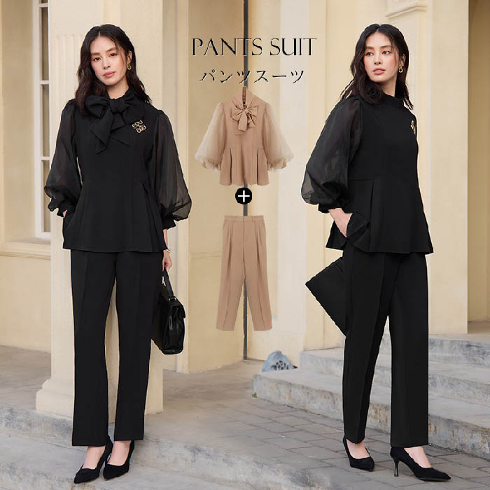 パンツスーツ セットアップ レディース 2点セット トップス ボリューム袖 透け感袖 リボン トップス テーパードパンツ 春 秋 ビジネススーツ 着痩せ シンプル カジュアル 女性らしい