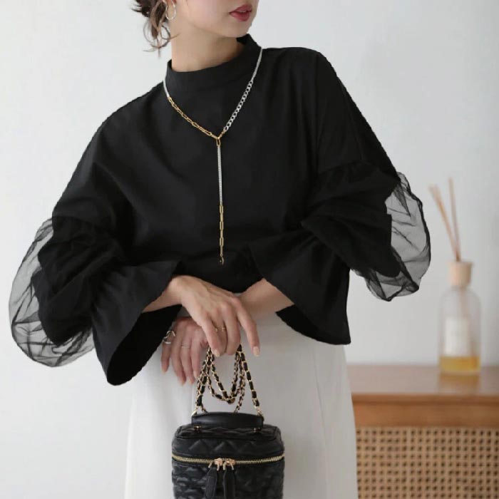 トップス チュール 切り替え レディース 春 秋 チュール ボリューム袖切り替え カットソー プルオーバー シャツ 異素材切り替え チュール トップス 春 秋 長袖 ゆったり 大人フェミニン