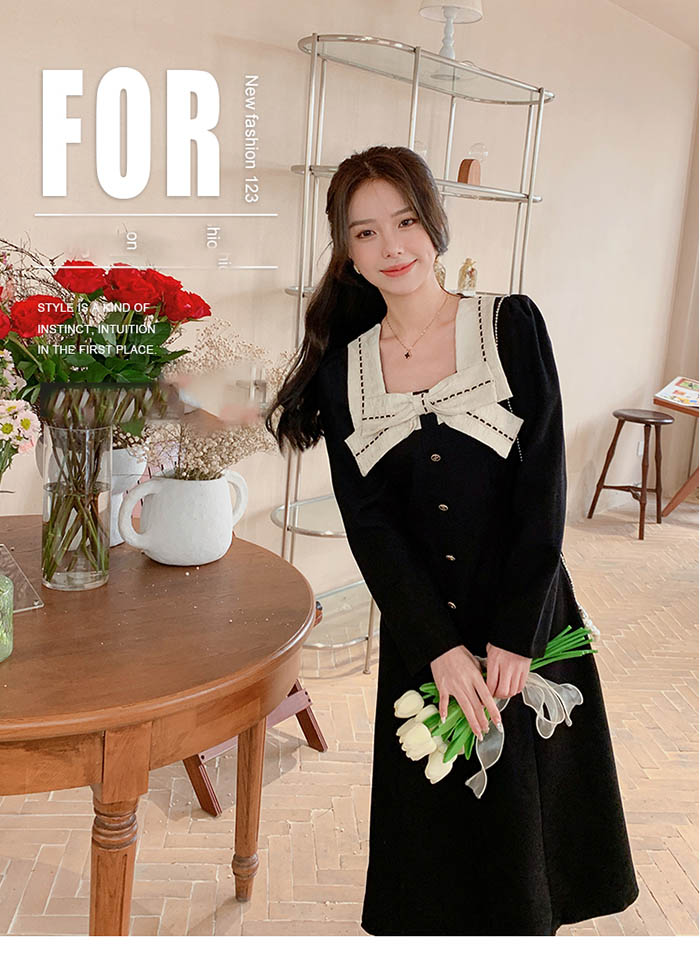 ワンピース スクエアカラー リボン 長袖 春物 春 夏 秋 レディース ふんわり オフィス ワンピース ロング丈 ガーリー ヴィンテージ カジュアル ワンピース ゆったり 大きいサイズ