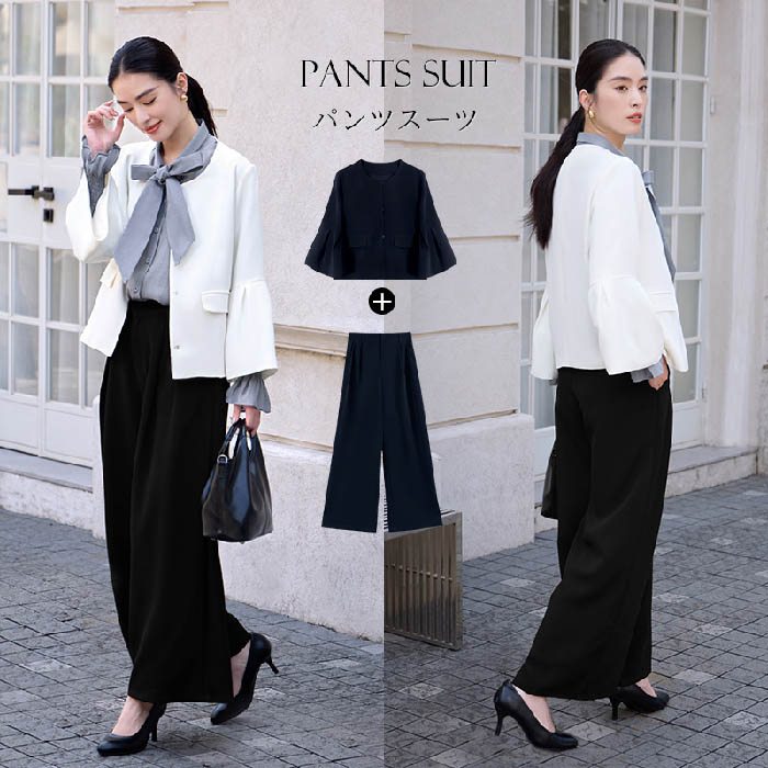 パンツスーツ セットアップ レディース 2点セット スーツ ジャケット ノーカラー ワイドパンツ 春 秋 ビジネススーツ ノーカラージャケット フレア袖 着痩せ シンプル カジュアル