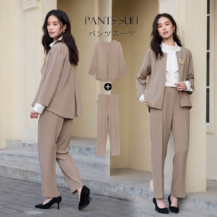 パンツスーツ セットアップ レディース 2点セット スーツ ジャケット ノーカラー テーパードパンツ 春 秋 ビジネススーツ ノーカラージャケット 着痩せ シンプル カジュアル 女性らしい