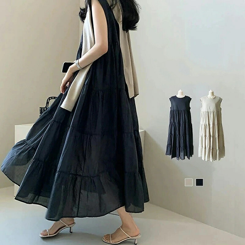 レディース シフォン ワンピース 夏新作 無地 ノースリーブ ラウンドネック プルオーバー ロングレディースファッション ワンピース