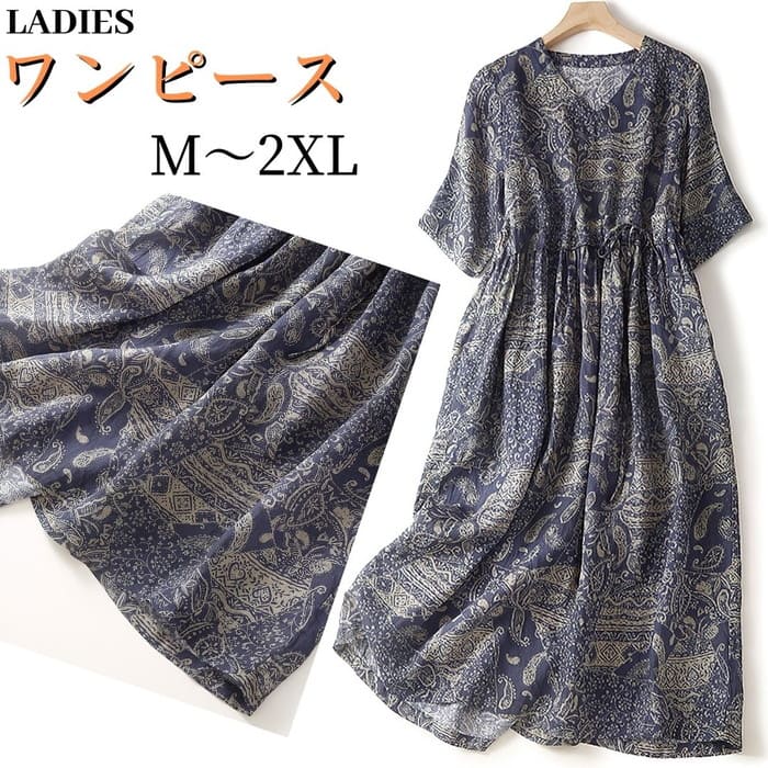 ワンピース レディース 半袖 プリント コットン リネン ネック 夏 ゆったり ナチュラル リラックス 旅行 お出かけ 母の日 プレゼント 30代 40代 50代 60代 シニア オシャレ 1560