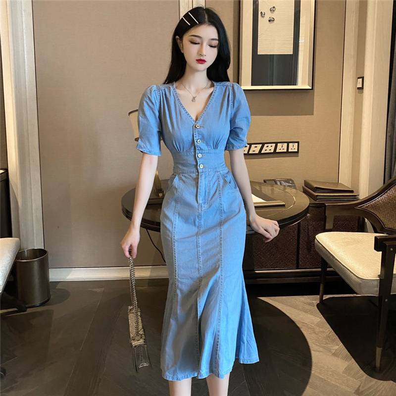 ワンピース レディース デニム 半袖 ミモレ丈 Vネック スリット タイト 無地 ウエストマーク 春 夏 秋 大人 かわいい きれいめ 上品 おしゃれ シンプル カジュアル