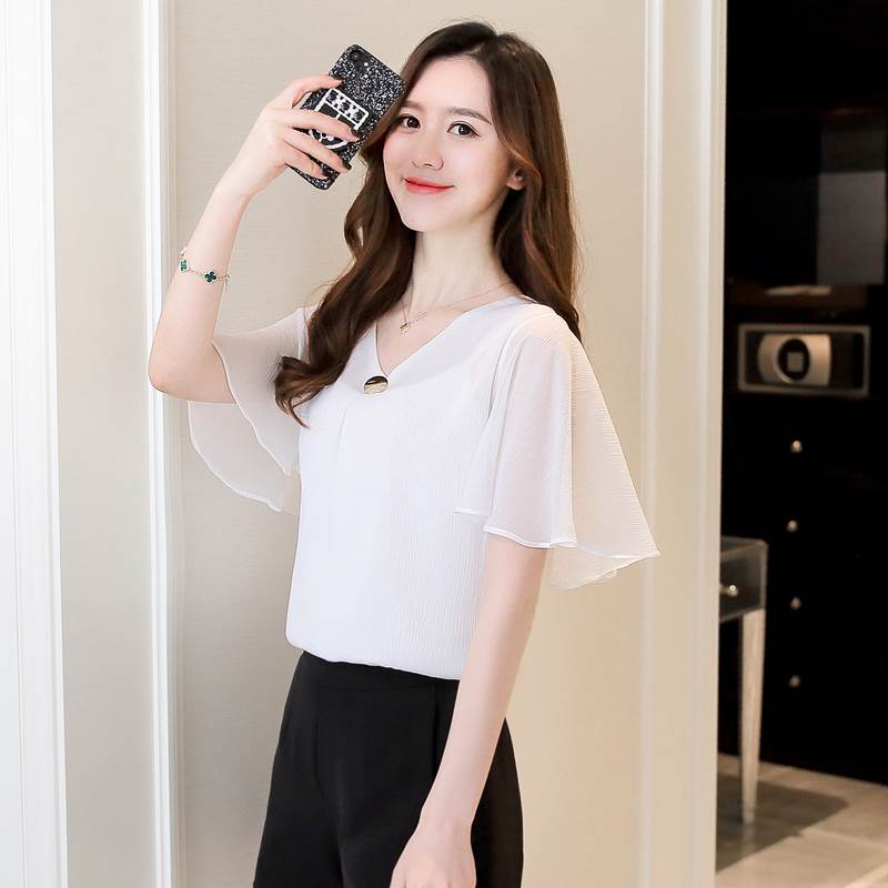 トップス ブラウス レディース シャツ 個性的 M L XL 2XL 3XL 4XL 大きいサイズ 白 ピンク アイボリー 無地 シフォン 春 夏 秋 半袖 Vネック ショート丈 ミドル丈 フェミニン