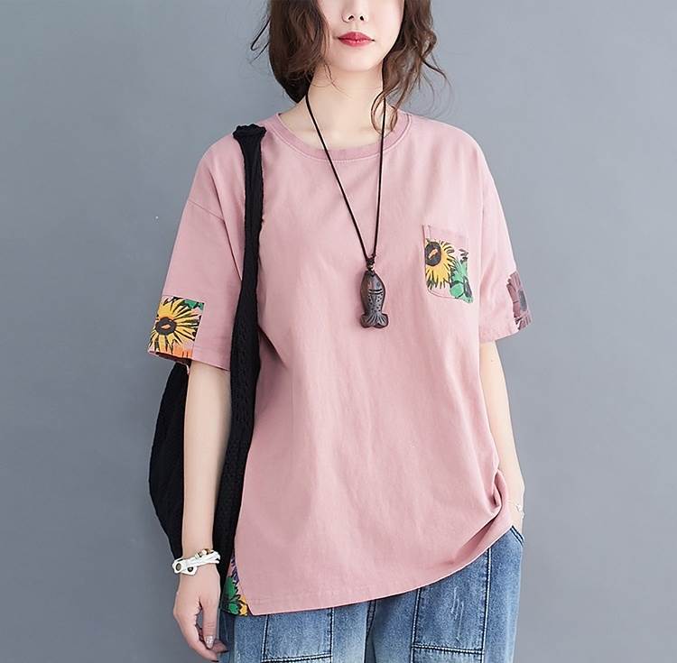 トップス レディース カットソー シャツ 個性的 半袖 ラウンドネック 花柄 レトロ ベージュ ピンク 青 緑 春 夏 秋 きれいめ おしゃれ シンプル ナチュラル カジュアル