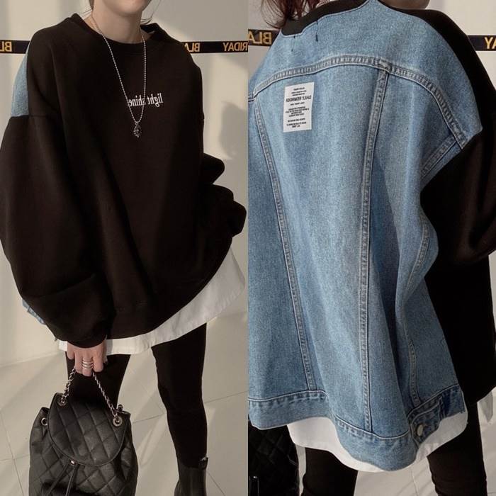 スウェット レディース トップス トレーナー プルオーバー ドッキング 切り替え デニム フリーサイズ ブラック グレー ベージュ くすみカラー 秋 冬 ラウンドネック 個性的