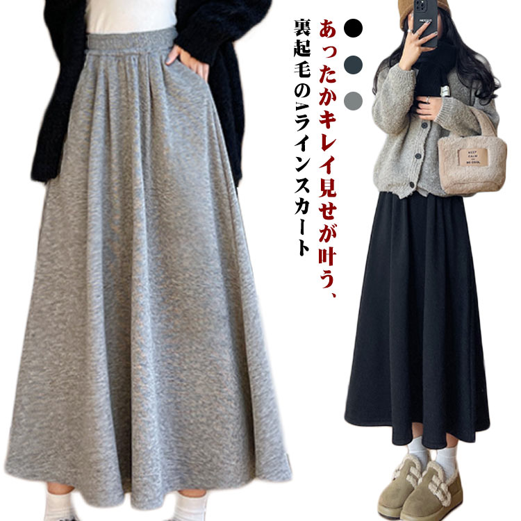 スカート 裏起毛 ポケットあり フレアスカート 裏起毛スカート Aライン ウォーム 暖か あったか ロング丈 暖かい 楽ちん 秋 冬