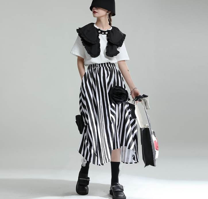 スカート 膝下 ミモレ丈 フレア かわいい おしゃれ レトロ キュート モード系 無地 ストライプ オールシーズン お出かけ イベント ホワイト ブラック ブルー モノトーン 個性的