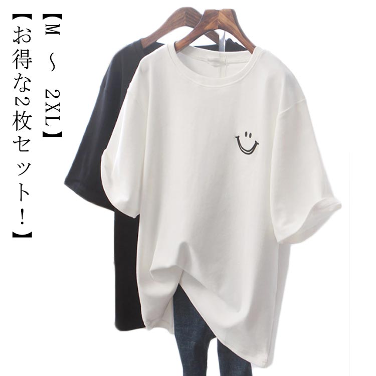 半袖 トップス レディース 夏 ホワイト 半袖tシャツ ゆるT カジュアル スマイル 白 黒 ブラック Tシャツ