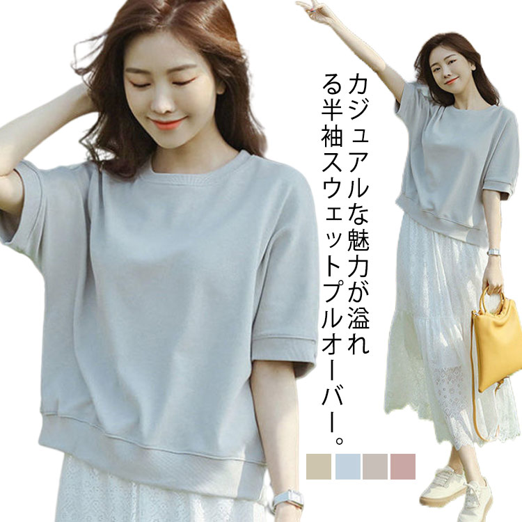 爽やかカジュアルな半袖シャツ スウェットプルオーバー ブルー ピンク グレーレディースファッション トップス シャツ カットソー