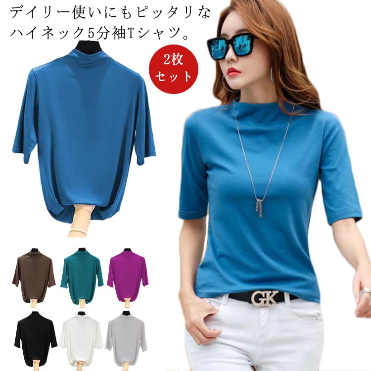 2枚セット シャツ カットソー レディース トップス 5分袖 五分袖 半袖シャツ 半袖シャツ タートルネック ハイネック ゆったり 大きいサイズ 無地 おしゃれ 春夏 春 夏 秋 春秋