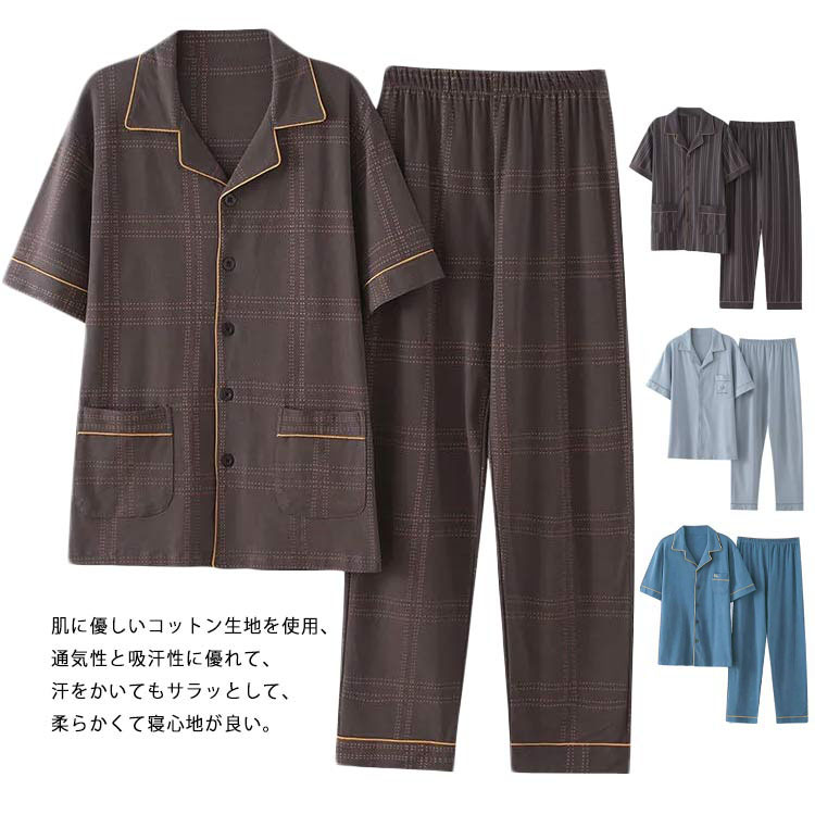 パジャマ メンズ 半袖 綿100% 夏用 前開き 2 3 4 上下セット 大きいサイズ チェック柄 無地