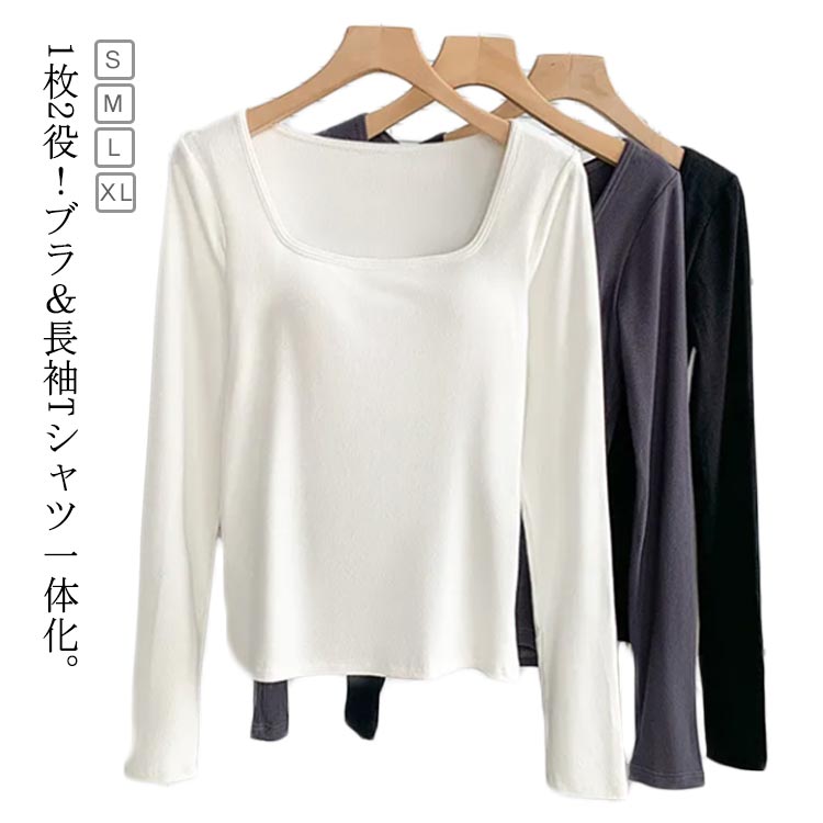 ブラいらずの解放感が魅力 カップ付き シャツ スクエアネックカットソー 秋服 秋物 20代 30代 40代 50代 インナー 重ね着 細身 スリム トップス 秋冬 ブラック ホワイト ダークグレー