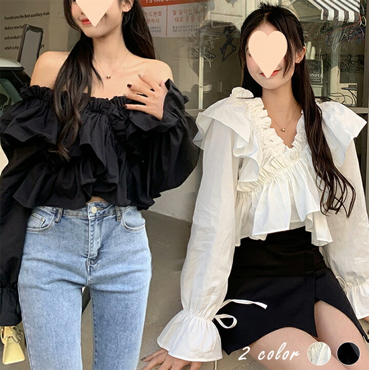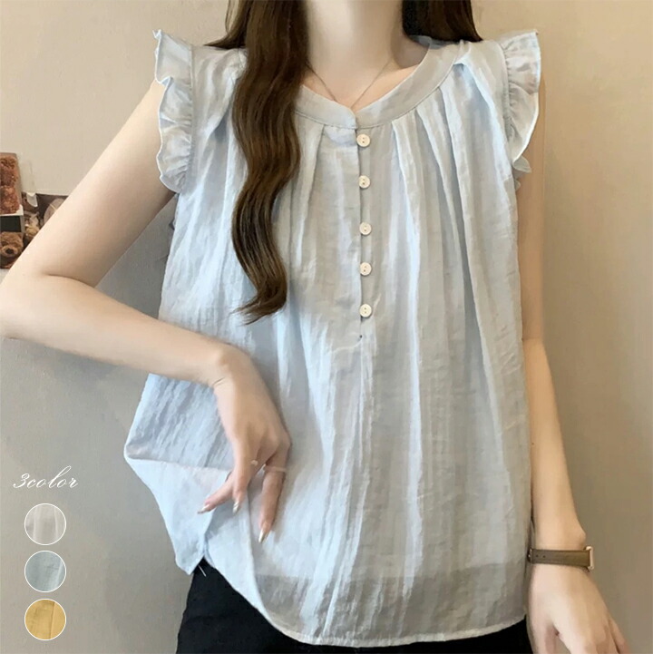 フリルノースリーブブラウス レディース 春 夏 トップス 大人可愛い 無地 韓国ファッション エレガントブラウス