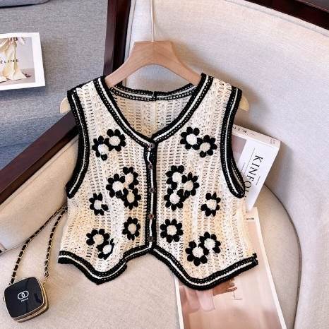 トップス ベスト ジレ 袖なし 襟なし Vネック 透かし編み 透け感 前開き ボタン かわいい 大人可愛い きれいめ シンプル 大人 上品 おしゃれ かっこいい 大人女子 こなれ感 都会的 花 レトロ