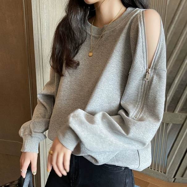 トップス トレーナー 袖あり 長袖 襟なし ラウンドネック 肩開き 肌見せ ファスナー かわいい 大人可愛い きれいめ シンプル カジュアル 大人 上品 おしゃれ 大人女子 こなれ感 メン かっこいい