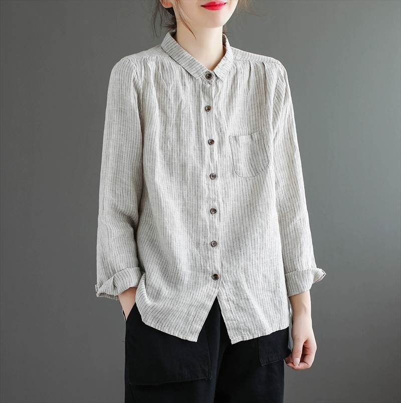 トップス シャツ ストライプ 袖あり 長袖 襟付き 前開き 綿 麻 リネン 薄手 コットン かわいい シンプル カジュアル 大人 上品 おしゃれ かっこいい アジアン 大人女子 ラフ メン 大人可愛い