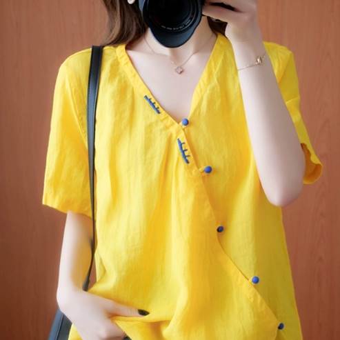 トップス シャツ ブラウス 袖付き 5分袖 襟なし Vネック 前開き ボタン 薄手 かわいい 大人可愛い きれいめ シンプル 大人 上品 おしゃれ かっこいい こなれ感 メンズライク ボーイ 大人女子