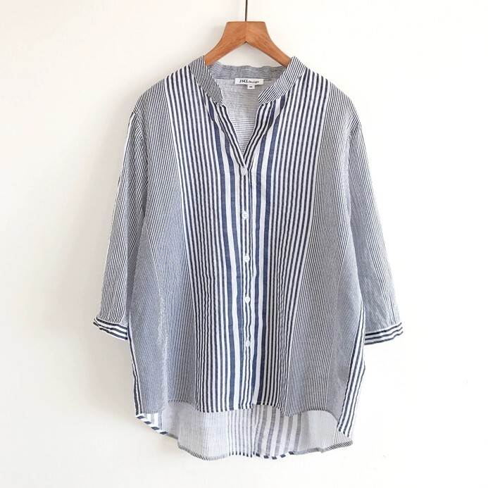 トップス シャツ ストライプ スタンドカラー 7分袖 ワイド かわいい シンプル カジュアル 大人 上品 おしゃれ こなれ感 ラフ クール 抜け感 春 夏 秋 前開き ボタン ストレート レディース
