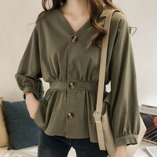 トップス ブラウス 長袖 バルーンスリーブ Vネック フレア ウエストマーク ボタン 可愛い きれいめ シンプル カジュアル 大人 おしゃれ 無地 春 秋 20代 レディース ミディアム丈 前 30代
