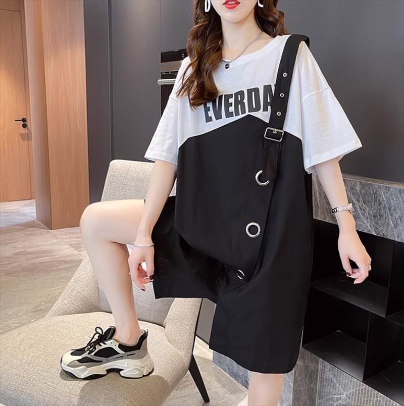フェイクツーピース レディース ワンピース Tシャツ サスペンダーワンピース ショートスカート ショート 半袖 Uネック Aライン アシンメトリー かわいい カジュアル おしゃれ かっこい 大人可愛い