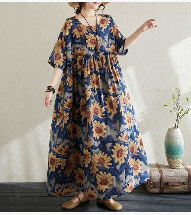 ロングワンピース 半袖 マキシワンピ 花柄 大きいサイズ 春夏 シャツワンピース 薄手 綿混 レディース チュニック 体型カバー ビッグシルエット お呼ばれ オーバーサイズトップス 大人シンプル 無地