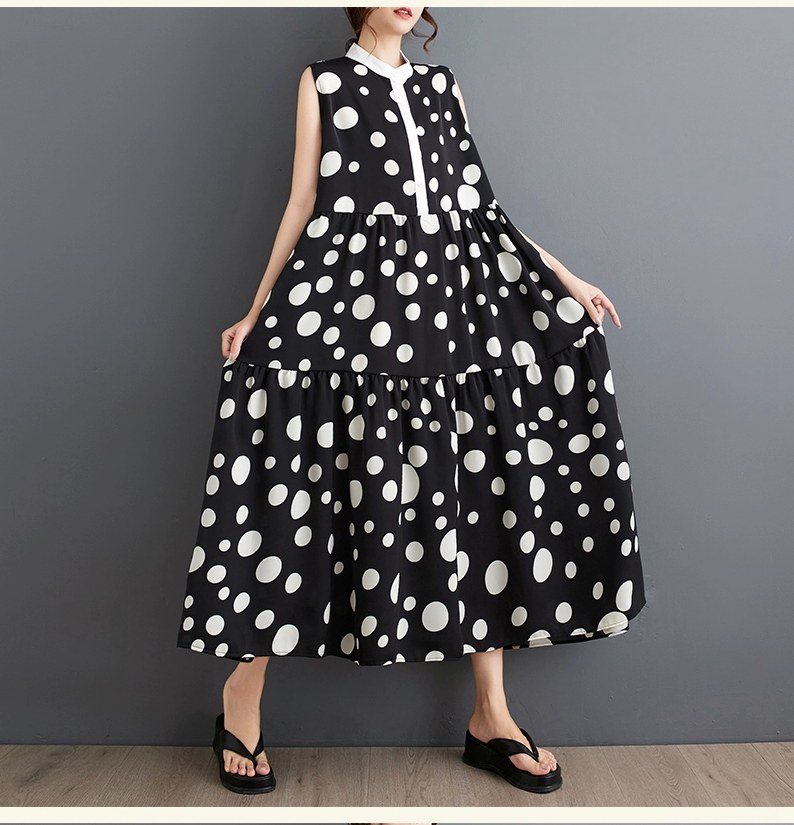 ドット ロングワンピース シャツワンピース ノースリーブ ロングチュニック 大きいサイズ ドットプリント 水玉 ワンピース 夏 袖なし 切り替え マキシ レディース 着痩せ きれいめ 大人 体型カバー