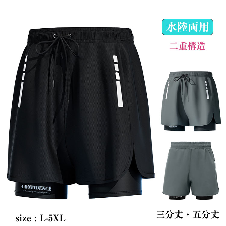 水着 スイムパンツ メンズ サーフパンツ 水陸両用 ビーチパンツ 三分丈 五分丈 ハーフパンツ 通気 速乾 二重構造 シンプル 大きいサイズ スイムウェア 男性用 L-5XL ブラック グレー