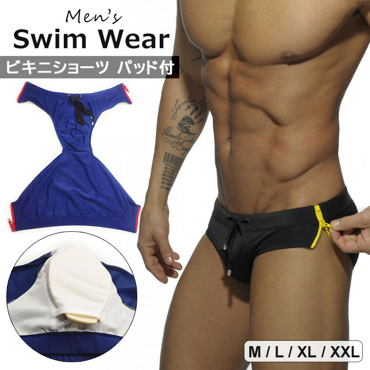 安心仕様の立体カップ付きメンズ用ビキニショーツ 水着 メンズ ビキニショーツ ローライズ 両サイドファスナー パッド付 海パン ビーチパンツ 海水パンツ インナーショーツ 全3色