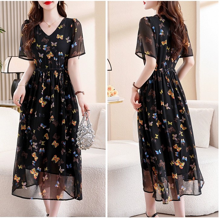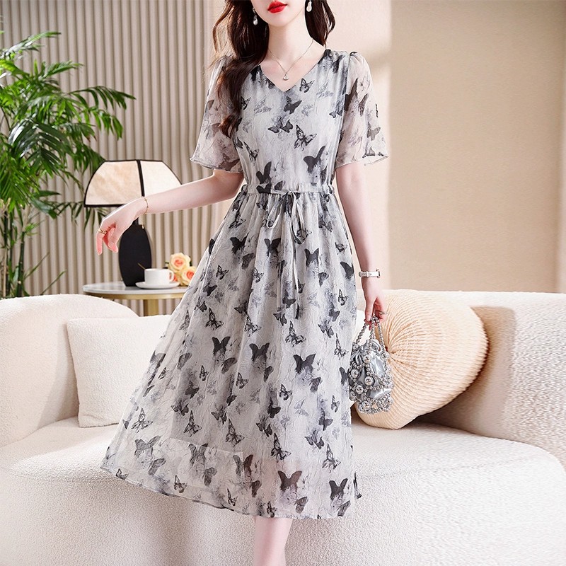ワンピ ロングワンピース Vネック マキシワンピース 夏 きれいめ 半袖 レディース プリント 蝶々 薄手 花柄ワンピース ドレス シャツワンピース チュニック カジュアルワンピース o 大きいサイズ