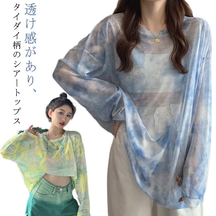 Tシャツ シアートップス タイダイ柄 tシャツ ロンT トップス シアー Uネック 透け感 UV シースルー カットソー 長袖 クルーネック レイヤード タイダイ染め 重 春