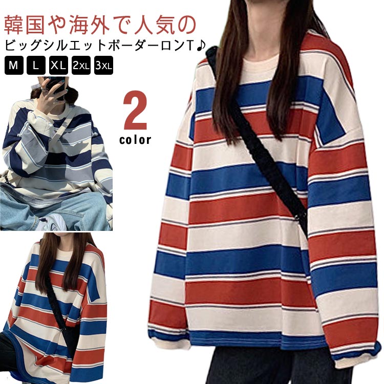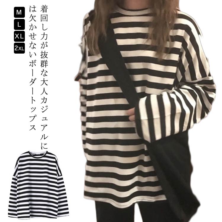 韓国ファッション 大きいサイズ オーバーサイズ 長袖 トップス ボーダー柄 着瘦せ ビッグシルエット Tシャツ カットソー ゆったり 体型カバー ルームウェア 薄生地 女性 長袖tシャツ プルオーバー