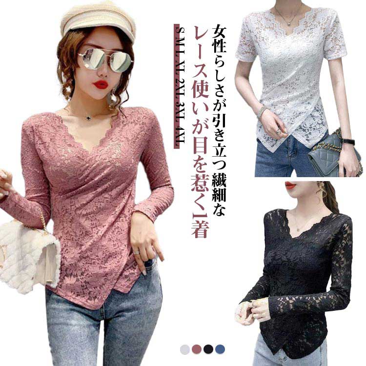 レース vネック tシャツ レディース きれいめ Vネック カットソー 冬 インナーウェア セクシー インナー 春 秋 総レース 長袖 30代 透け感 女性 大きいサイズ アシンメトリ 大人