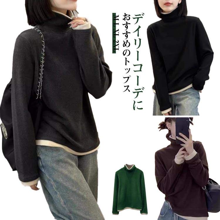 ~4 タートルネック カットソー カジュアル 重ね着風 ゆったり 長袖