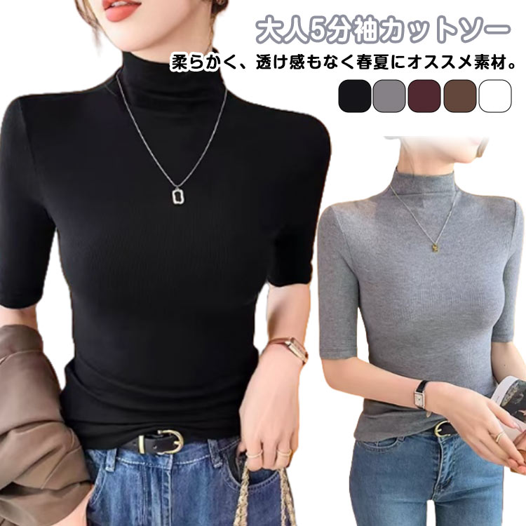 春 タートルネック カットソー ハイネック 5分袖 レディース レイヤード ストレッチ 無地 半袖Tシャツ 夏 スリム タイト インナー シンプル フィット 大きいサイズ 20代 薄手
