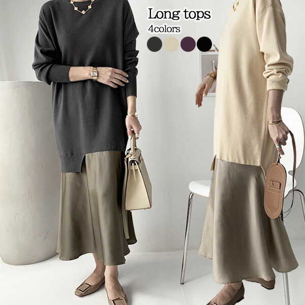 1K 切替ワンピース ロングワンピ レディース トップス Tシャツ ロンT 長袖 ニット ロングTシャツ