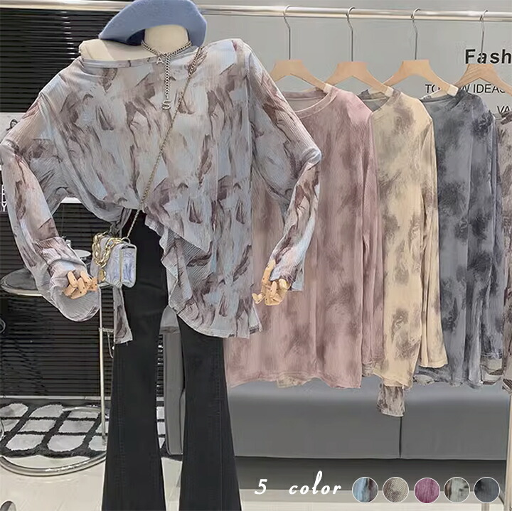 1B25 シアートップス プリーツシアートップス レディース UV対策 タイダイ柄 シースルー トップス ロング Tシャツ 長袖 ゆったり セクシー 透け 薄手大人ファッション カットソー