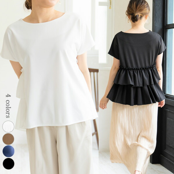 1K 半袖 バックプリーツトップス レディース カットソー フリル ベージュ ブラック ネイビー Tシャツ ゆったり ホワイト