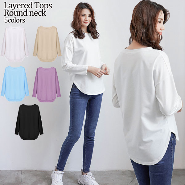 2A12 ラウンドネックレイヤードトップス カットソー ブラック ホワイト パープル ブルー ベージュ 長袖 ラグラン サイドスリット バーゲン Tシャツ