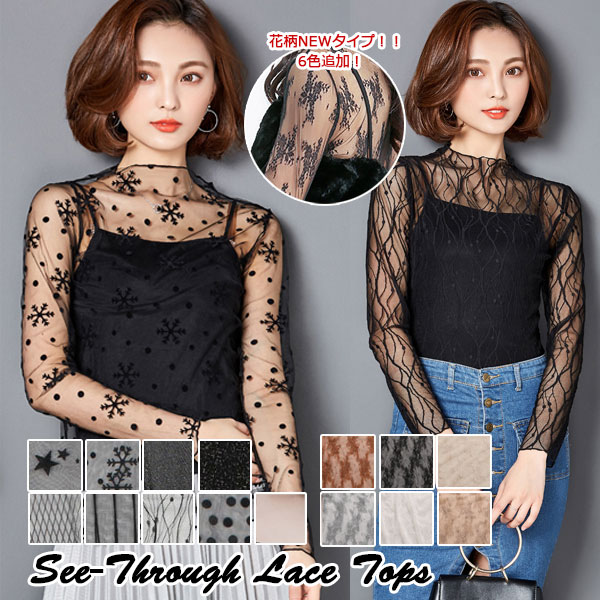 1B33シアーレーストップス レーストップス チュール シースルー レース レースカットソー ラメ ハイネックブラウス ブラックレース セクシー ハイネック