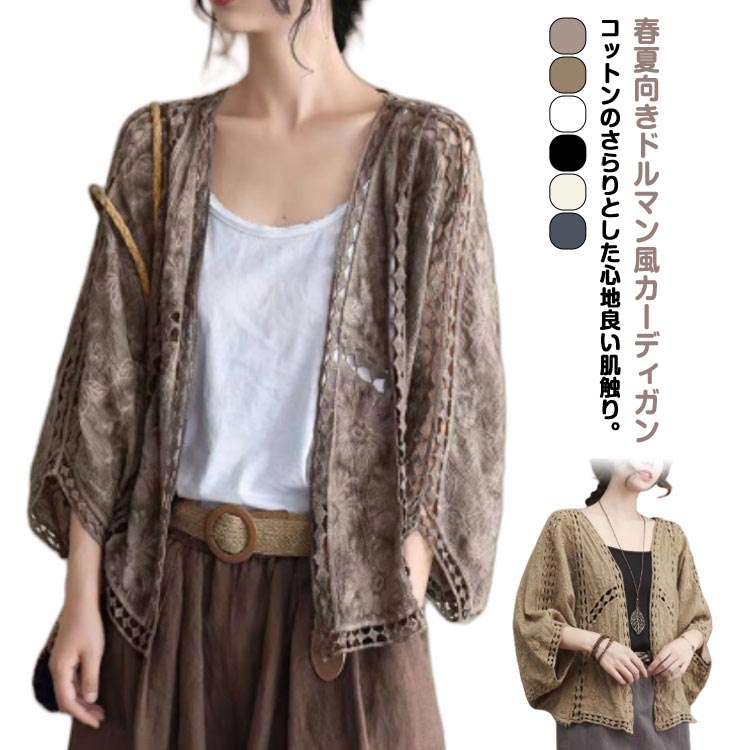 透ける 体型カバー カーディガン 羽織もの 羽織 羽織り 透かし彫り 透け彫り 夏 レディース 綿 ドロップショルダー ドルマン サマーカーディガン レースカーディガン トップス ボレロ