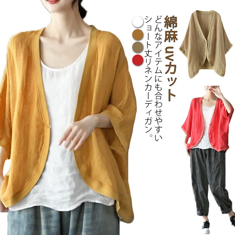 夏 リネン 日除け カーディガン 羽織り 綿麻 ボレロ レディース 薄手 シャツブラウス uvカット 春 7分袖 日焼け ショート 体型カバー 涼しい 可愛い シャツ ワンボタン
