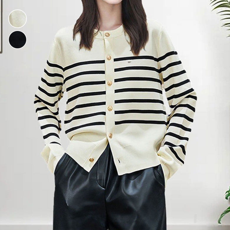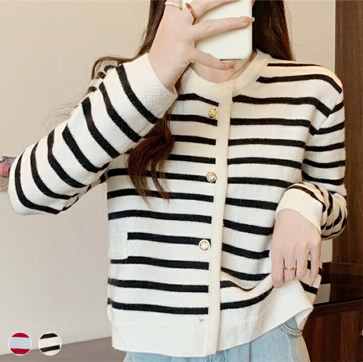 3B15 ボーダー ニット カーディガン レディース 春 秋 トップス アウター 羽織り ニットカーデ 長袖 長袖ニット 長袖カーディガン きれいめ お洒落 シンプル レイヤード レトロ 韓国 重ね着