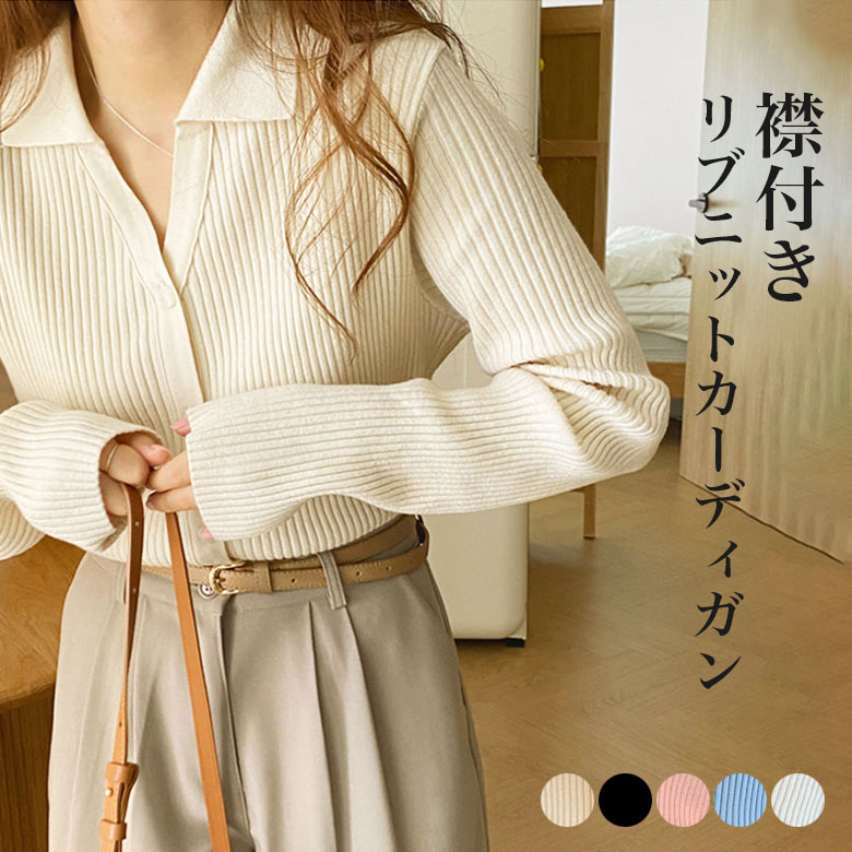 リブニット カーディガン ネック 襟付き ニット シンプル 長袖 きれいめ オシャレ