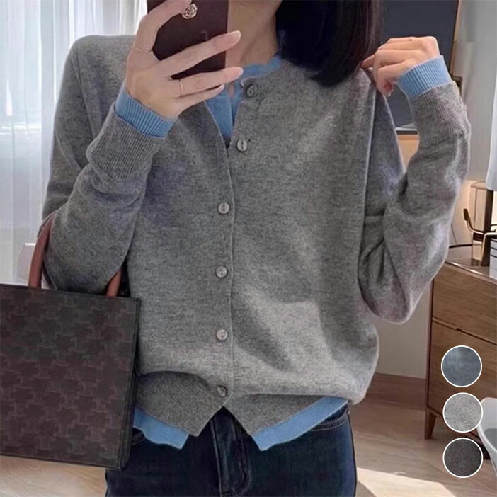 1K フェイクレイヤード 長袖 ニットカーディガン セーター レディース 秋 冬 重ね着 カーディガン カジュアル お洒落 ジャケット 重ね着風カーディガン 韓国 ニットジャケット