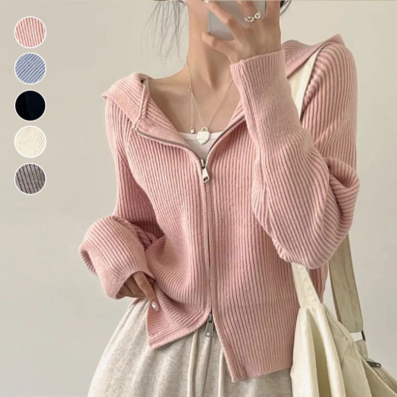ニット カーディガン レディース フード付き フロントファスナー リブニット 羽織り トップス カジュアル 秋 冬 ニットカーディガン おしゃれ シンプル 韓国ファッション フード