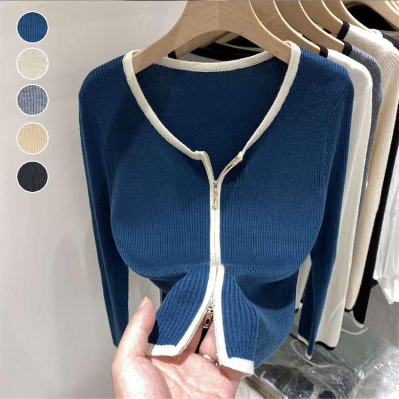 ショート ニット カーディガン フロントファスナー ジップカーディガン スリム ダブルジッパー