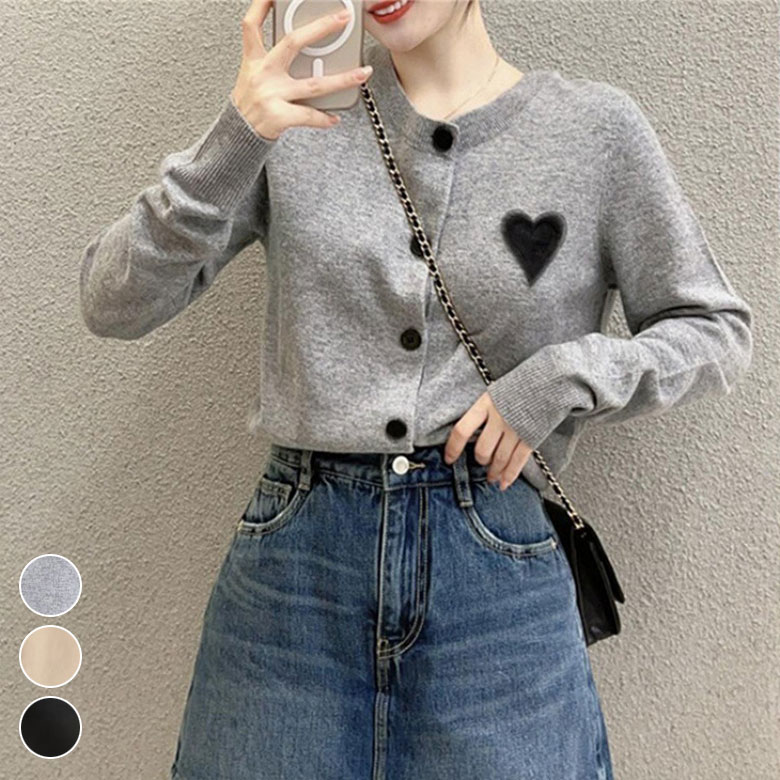 ハートロゴ ニット カーディガン レディース 春 秋 ハート ショート丈 長袖 トップス アウター 羽織り 長袖カーディガン ニットカーデ セーター お洒落 韓国ファッション カジュアル