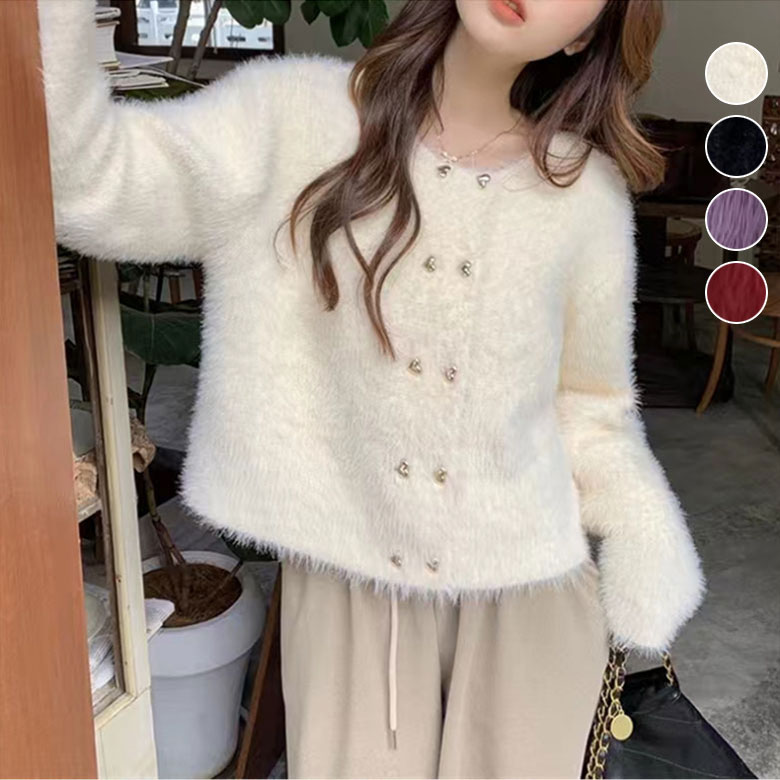 モヘア ニット カーディガン ミンクタッチ ショート丈 ダブルブレスト ふわふわ 暖かい トップス アウター 羽織り